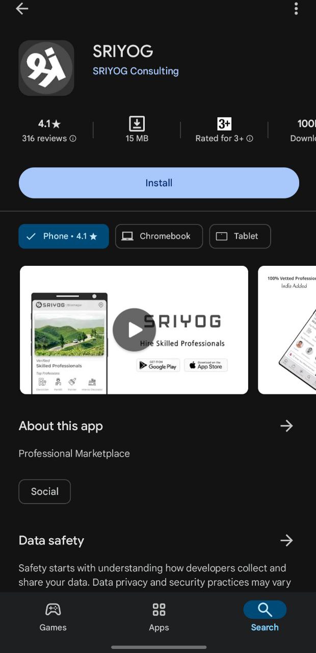 For Professionals: Your verified profile is listed in your city and promoted on SRIYOG’s app and website. Clients search for services by location/profession and contact you directly through the app. -